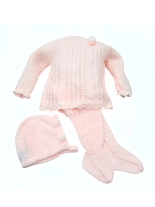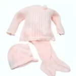 Chaquetita ML, adornada en pechera con ochos. Abertura trasera con botones. Mangas y bajos de chaquetita adornadas con ondas. Polaina con pies. Capota adornada alrededor con ondas a juego de los bajos de la chaquetita y mangas.