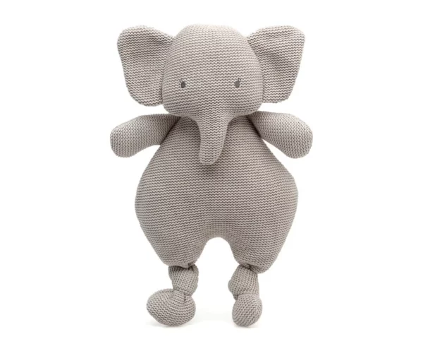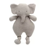 - Peluche elefante. Este delicado peluche está elaborado en punto de algodón 100%, lo que le aporta una textura suave, natural y muy agradable al tacto. Su diseño artesanal transmite calidez y sencillez, convirtiéndolo en un compañero perfecto para los primeros años del bebé. Como detalle especial, lleva una cinta de raso anudada alrededor del cuello, que añade un toque elegante y dulce al conjunto. Apto para menores de 3 años por lo que es un peluche completamente seguro. Tamaño 34cm. Color Gris.
