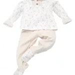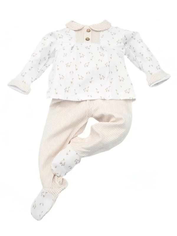- Pijama 2 Piezas de algodón peinado 100%. Alta calidad. Destaca por su suavidad y resistencia. Fondo blanco con ocas en color arena. La parte superior está adornada con cuello bebé en rayita arena y pechera en rayita arena y adornada con 2 botoncitos. Fabricado en España. Color arena.