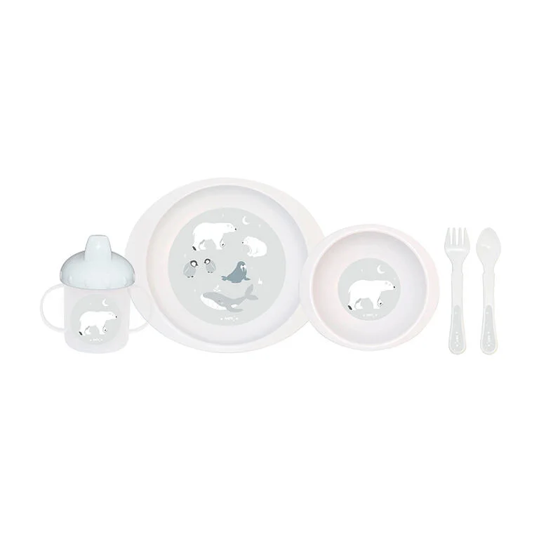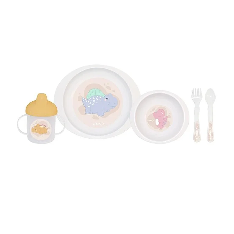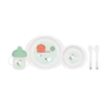 - Vajilla 5 piezas: Un set completo de vajilla compuesto por Plato, Bol, Vaso de aprendizaje con tapa y asas, Cuchara y tenedor. Fabricado con materiales seguros, ligeros y resistentes, ideales para las primeras comidas autónomas del bebé. Sus diseños suaves y coloridos favorecen el aprendizaje y hacen que cada comida sea más divertida. Material no tóxico. Libre de Bisfenol-A. Fabricado en PP. El plato y el cuenco son aptos para calentar en microondas. Apto para lavavajillas (sólo en la bandeja superior). Color rosa, azul, verde o gris.