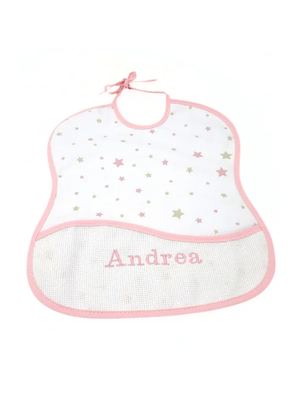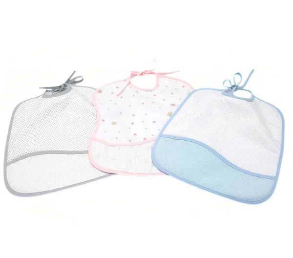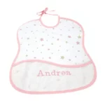 - Babero de algodón, cuadrado con cintas para anudar. Adornado en la parte delantera con un bolsillo. Color rosa, azul o gris.
