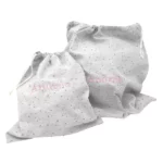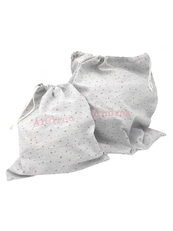 - Bolsa de guardería. Está confeccionada en tela de algodón, suave, resistente y de fácil lavado, ideal para guardar la ropita, pañales o los pequeños esenciales del día a día del bebé. Cuenta con un cordón ajustable que permite abrir y cerrar la bolsa con facilidad, manteniendo todo el contenido bien protegido. Además, el cordón funciona como asa. Color gris. Tamaño 44x35cm.
