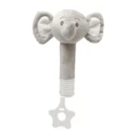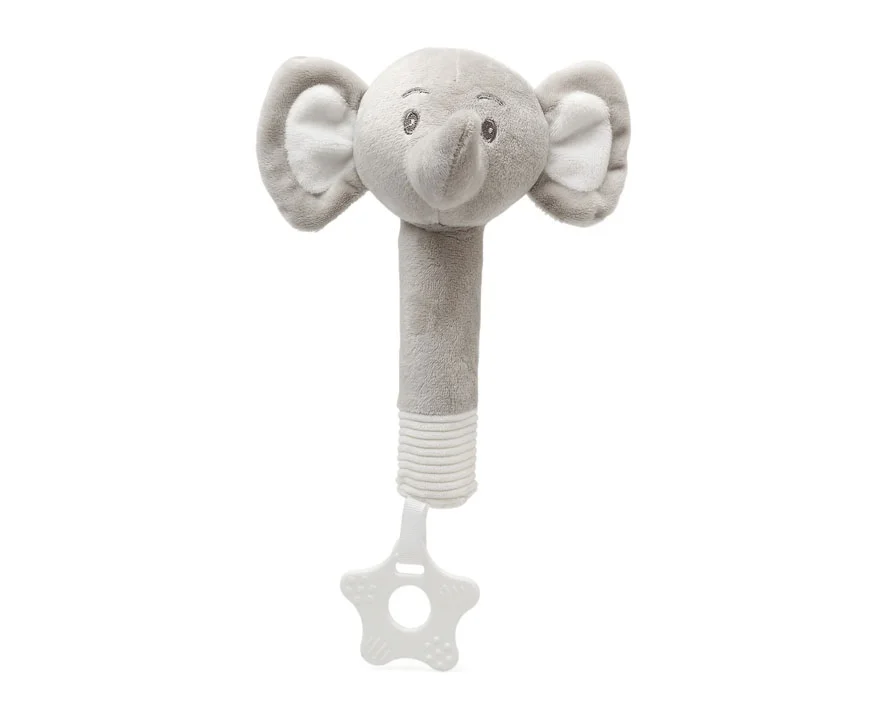 - Sonajero con mordedor. Su forma le permite al bebé cogerlo él solo con la mano. En su interior incluye sonidos que estimularán sus sentidos si presiona o aprieta el peluche. En la parte inferior, nuestro sonajero incluye un mordedor en silicona para que el bebé lo pueda morder y aliviar sus molestias. Al tener varias texturas le masajea las encías y le calma el dolor. Color rosa o gris.
