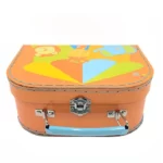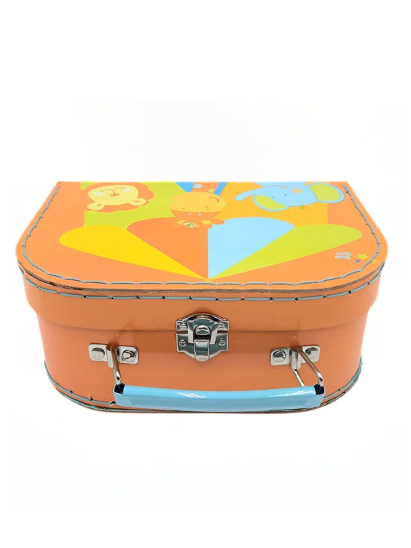 - Presentada en Maleta decorada en tapa con perritos y gatitos, la base de la maleta, en tono gris. Tamaño 23x15x7cm.