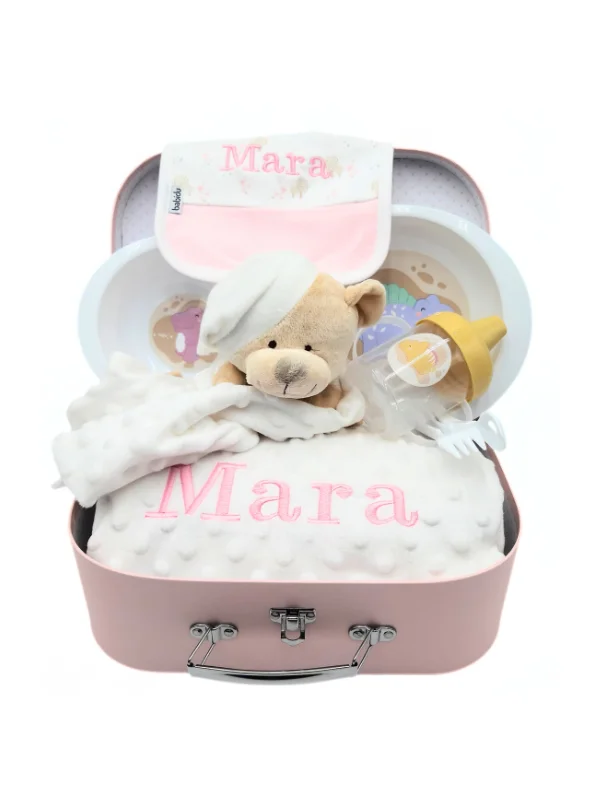 - Tarjetón personalizado con el nombre del bebé y dedicatoria.