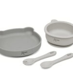 • Vajilla 4 piezas silicona. Ecofriendly. Compuesta por 1 cuenco, 1 plato, 1 cuchara y 1 tenedor. Está pensada para que pueda aprender a comer él solo. Esta vajilla práctica y fácil de usar, tiene una ventosa para que la puedas fijar a la mesa y que no se mueva. Está fabricada en suave silicona de alta calidad para uso alimentario, ofreciendo las ventajas de este material: no absorben olores ni sabores y su forma y textura se mantienen inalteradas con el uso y el contacto con otras sustancias. Resiste temperaturas extremas que van desde los 60 grados hasta 260 grados sin deformarse. Por lo que podrás usarlo en el lavavajillas, microondas o congelador sin ningún problema. Se elabora con sílice de arena, por lo que es un material de origen natural. Material no tóxico, hipo alergénico y muy seguro en los utensilios de alimentación infantil.